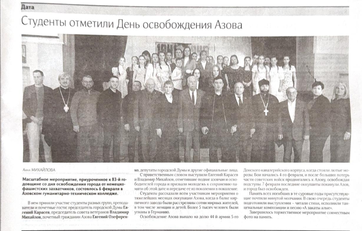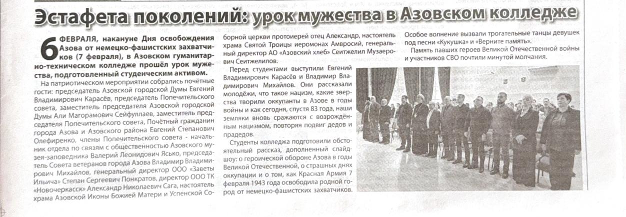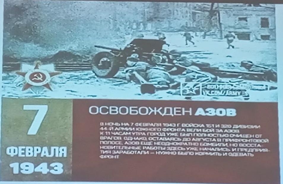 6 февраля в нашем колледже состоялся особенный урок мужества, посвященный 83-й годовщине освобождения города Азова от немецко-фашистских захватчиков. Этот день напоминает нам о героизме и стойкости наших предков, которые сражались за свободу и независимость нашей Родины.